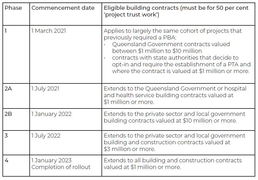 On 1 July 2021, the next phase of the implementation of the requirement for head contractors to establish Project Trust Accounts (PTAs) and Retention Trust Accounts (RTAs) on Queensland projects commences.
