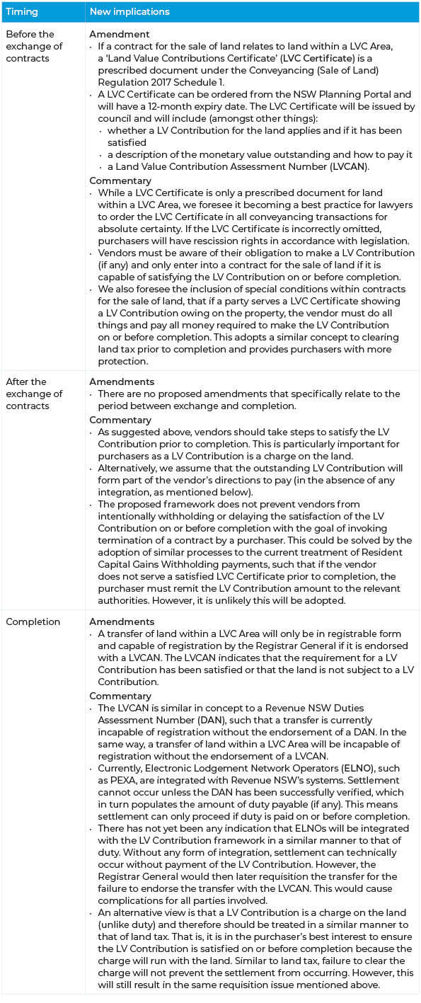 Land which is subject to a LV Contribution cannot be transferred to another person, unless the LV Contribution has first been satisfied. Accordingly, the LV Contribution framework has implications for NSW conveyancing practices. We expect there will be an increase in commentary and/or additional amendments to conveyancing legislation in the coming months as there has been little scrutiny about the implications from a conveyancing perspective.