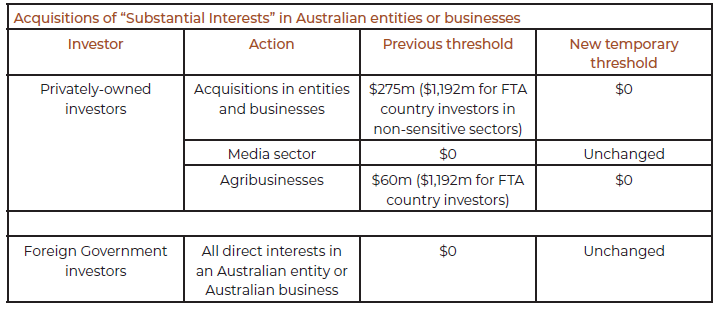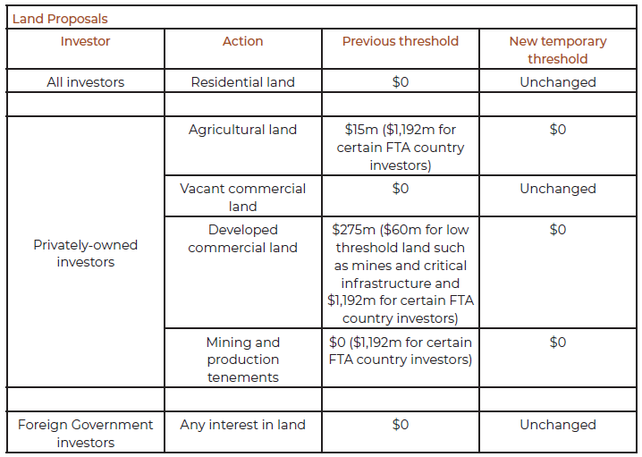 As part of the temporary changes, the Treasurer has reduced the monetary screening thresholds to $0 for all foreign investment under the Foreign Acquisitions and Takeovers Act 1975 (Cth) (FATA).