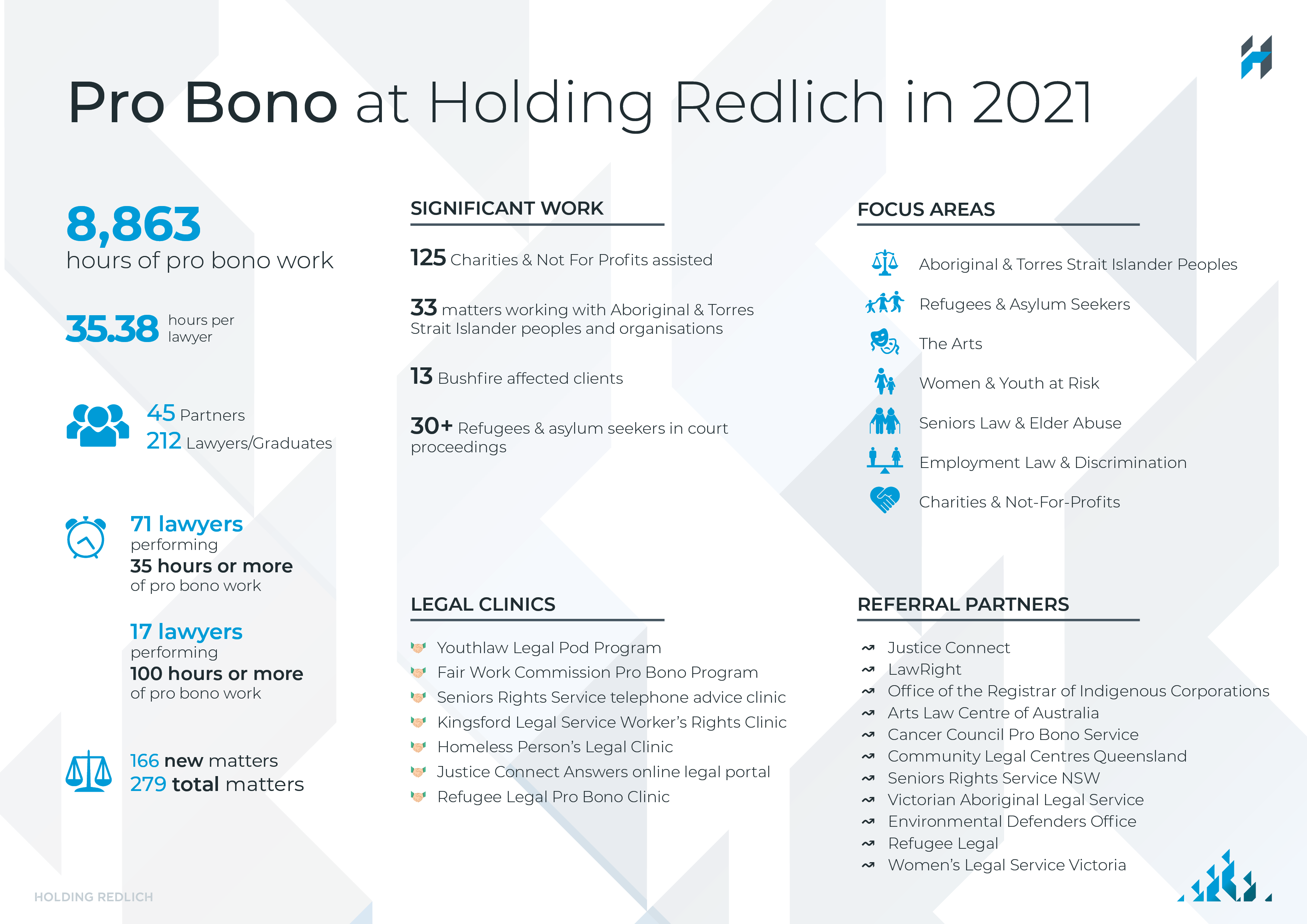 At Holding Redlich, pro bono work is an integral part of our legal practice. Its purpose, to provide assistance to charities and to individuals who may not be able to access the legal system, is part of our DNA. As part of our pro bono commitment, the firm is a signatory to the National Pro Bono Target of 35 hours per lawyer per year.
