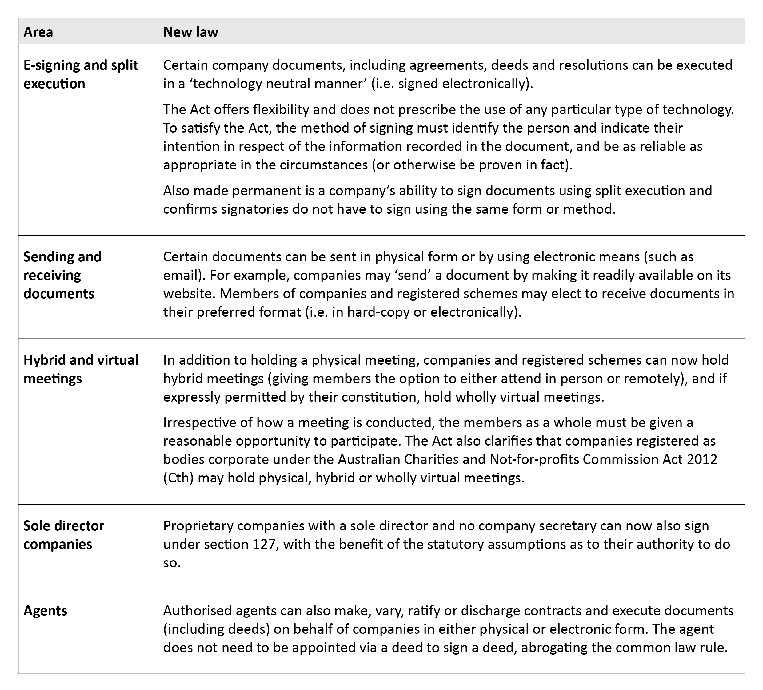 After a long wait, the Corporations Amendment (Meetings and Documents) Act 2022 (Cth) (Act) received royal assent on 22 February 2022. What began as a suite of temporary relief measures introduced in response to the COVID-19 pandemic has now led to permanent changes to the Corporations Act 2001. Companies can now continue to use technology to validly execute documents, hold meetings and distribute meeting materials on a permanent basis. The changes come just in time, with the temporary measures due to expire on 31 March 2022.