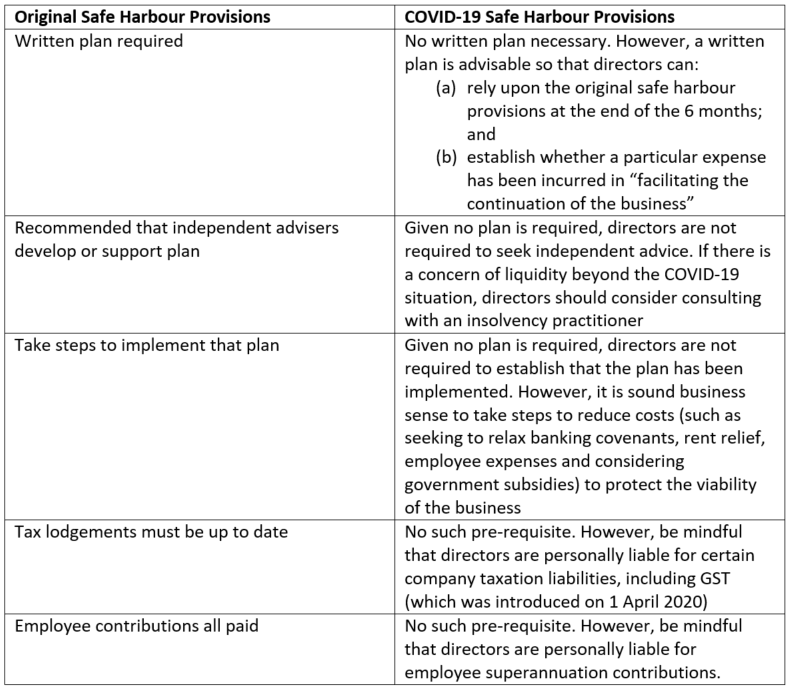 The key differences between the original Safe Harbour provisions and the COVID-19 Safe Harbour provisions are: