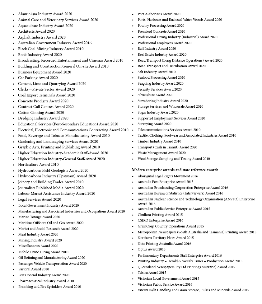- 1.75 per cent increase to modern award minimum wages with staggered increases for Group 1 Awards on 1 July 2020, Group 2 on 1 November 2020 and Group 3 on 1 February 2021