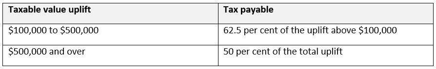 With a taxable value uplift (from rezoning) of over $100,000, the tax payable can be calculated at the following rates:
