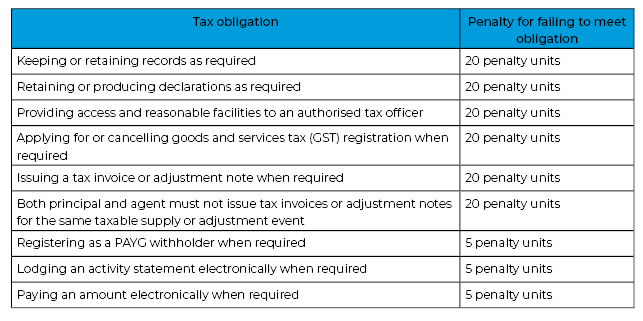 Non-compliant conduct by taxpayers where there is no shortfall, or for various actions in breach of tax obligations, can attract a penalty, calculated in penalty units, the value of which is as follows: