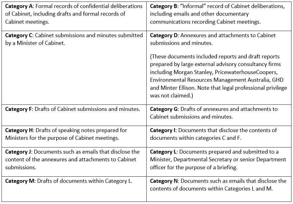 The definition of “Cabinet documents” is broad. The decision in ACCC v NSW Ports highlights that different categories of Cabinet documents will enjoy different levels of protection. As such, analysis is needed for every document which is claimed to be immune from disclosure having regard to the type of Cabinet document it is, and the content of the document. As noted by Justice Wigney: