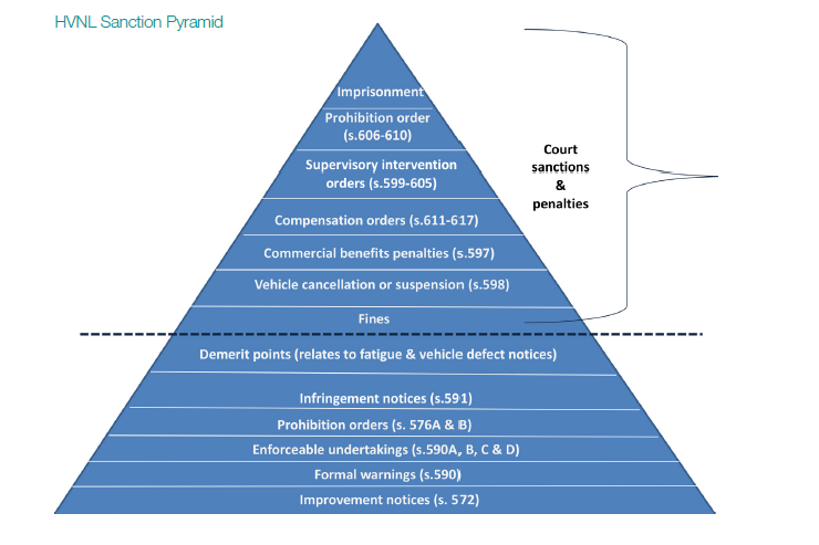 To put the above into perspective, the below HVNL Sanction Pyramid graphically sets out the possible enforcement action and penalties associated with breaches of the HVNL: