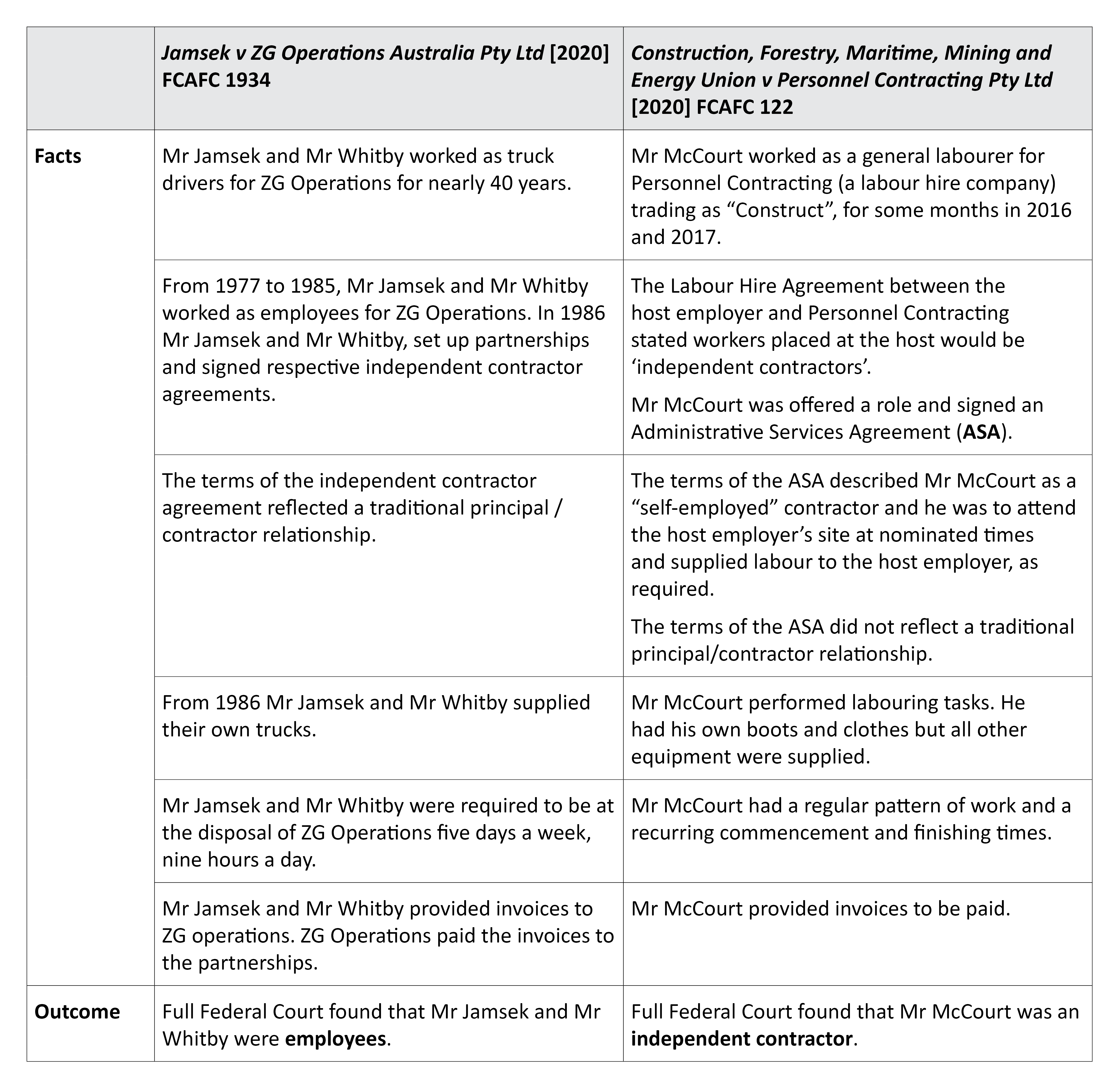 The High Court overturned both of the Full Federal Court decisions. In CFMMEU v Personnel Contracting, it was found that Mr McCourt was an employee and in ZG v Jamsek, it was found that Mr Jamsek and Mr Whitby were independent contractors.